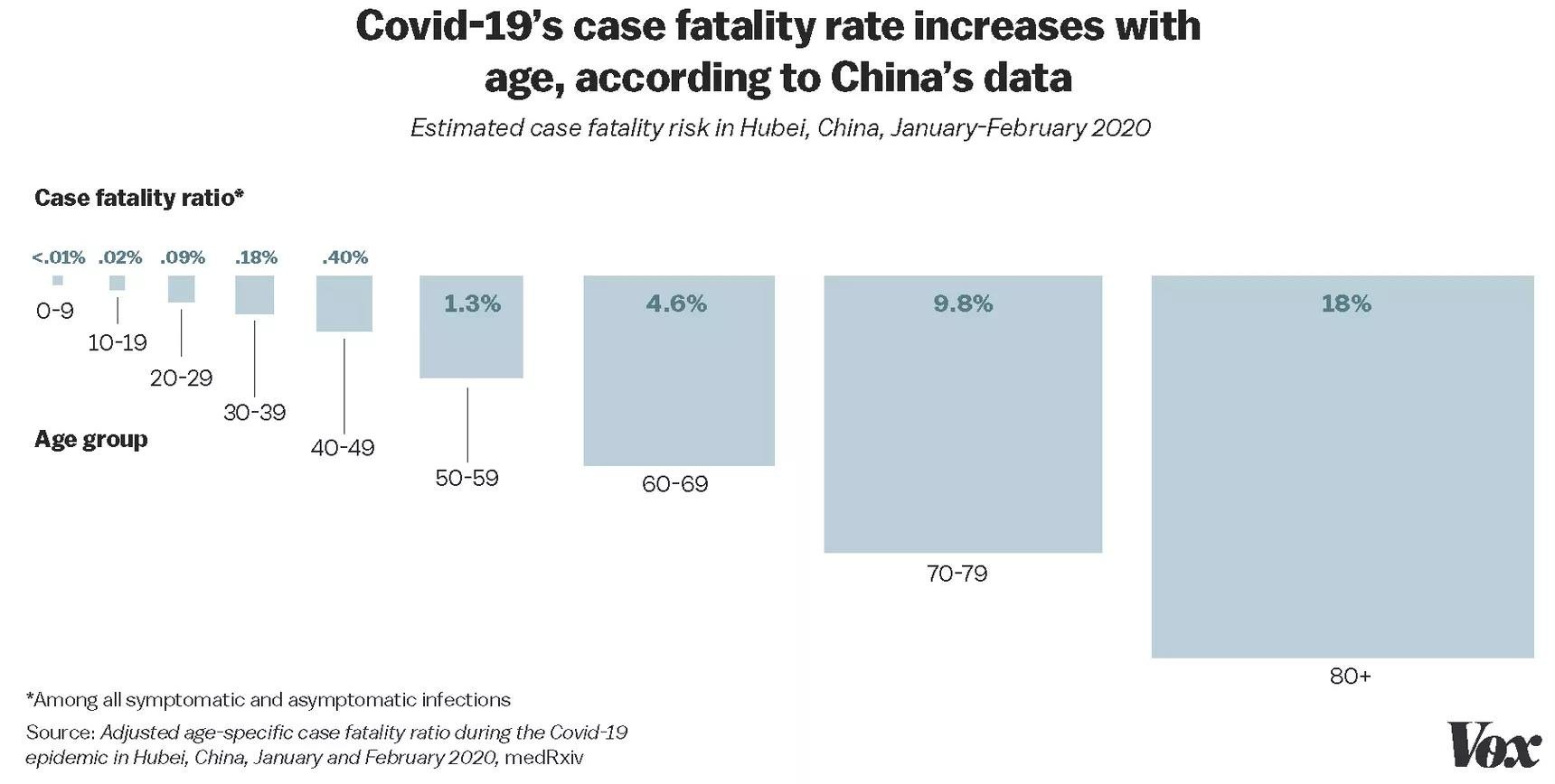 Data indicates that the CFR (case fatality rate) goes up with age. Therefore, the highest risk group are my parents and grandparents. It will be different for everyone, but it is probably a good idea to remind them of the proper hygiene precautions, make sure they know how to reach you when they need groceries or anything else out of the house, and make sure they are informed with the fast-moving information around testing, precautions, and symptoms. Although the highest risk group is elderly, the long-term effects of the virus are not yet fully known, and if you are in the group that requires hospitalization or shows severe symptoms, it is very unpleasant.